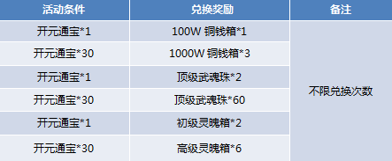 【活动内容】活动期间,使用开元通宝可以兑换铜钱,武魂和灵魄参与富甲天下活动。